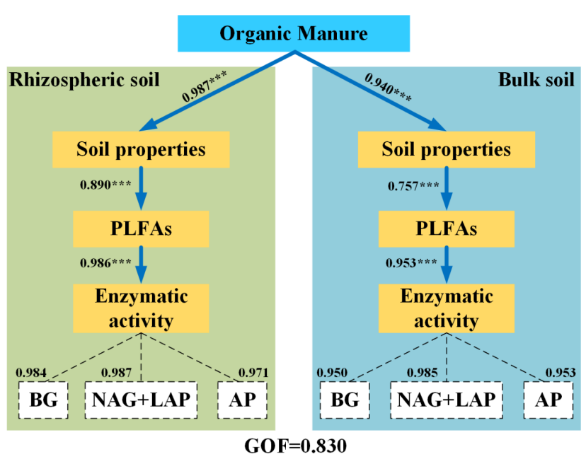 圖1. 大豆根際和非根際土壤對不同有機(jī)肥施用量響應(yīng)的偏最小二乘法路徑分析圖