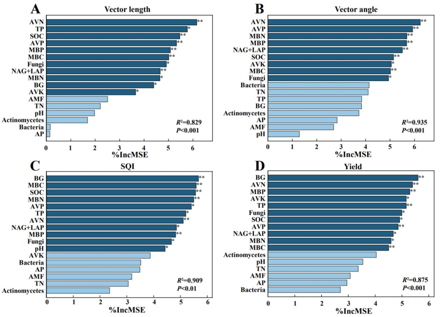 ????基于偏最小二乘法路徑分析的研究結(jié)果表明,大豆根際土壤性質(zhì)、微生物生物量及胞外酶活性對不同有機(jī)肥施用量的響應(yīng)大于非根際土壤(圖1)。因此選用大豆根際土壤作為研究對象,進(jìn)一步分析不同種類有機(jī)改良劑(秸稈或有機(jī)肥)配施化肥如何調(diào)控根際土壤質(zhì)量及大豆產(chǎn)量。隨機(jī)森林分析結(jié)果表明,堿解氮(AVN)的含量是影響微生物資源碳限制(向量長度)及磷限制(向量角度)的關(guān)鍵因素;而β-葡萄糖苷酶活性(BG)則是影響土壤質(zhì)量指數(shù)(SQI)及大豆產(chǎn)量的關(guān)鍵因素(圖2)。在有機(jī)肥配施化肥(NPKM)下,大豆產(chǎn)量及土壤質(zhì)量指數(shù)分別比秸稈配施化肥處理(NPKS)高5.99%及46.55%,且大豆產(chǎn)量、土壤質(zhì)量指數(shù)均與微生物資源碳(向量長度)和磷(向量角度)限制呈負(fù)相關(guān)關(guān)系(圖3)。因此,從保護(hù)黑土地質(zhì)量及確保東北“黑土糧倉”的國家糧食安全的角度來看,有機(jī)肥配施化肥是一種有效的長期土壤管理方式。