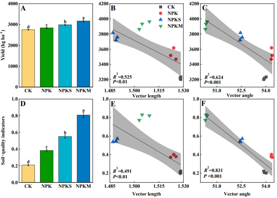 圖3. 不同有機(jī)改良劑配施化肥對大豆產(chǎn)量(A)和土壤質(zhì)量指數(shù)(D)的影響;大豆產(chǎn)量與向量長度(B)和角度(C)的關(guān)系、土壤質(zhì)量指數(shù)與載體長度(E)和角度(F)的關(guān)系