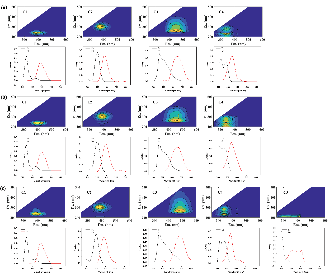 圖1. 通過(guò)平行因子分析法(PARAFAC)確定的水溶性有機(jī)質(zhì)(a),富里酸(b)和胡敏酸(c)的熒光組分