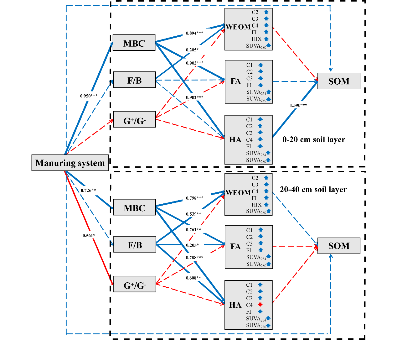 ????為此,東北地理所黑土保護(hù)與利用學(xué)科組研究人員利用長(zhǎng)期定位實(shí)驗(yàn)和三維熒光光譜、紫外光譜以及磷脂脂肪酸等技術(shù),探究了長(zhǎng)期施用有機(jī)物料對(duì)黑土溶解性有機(jī)質(zhì)結(jié)構(gòu)的影響。研究結(jié)果表明,長(zhǎng)期施用有機(jī)物料可顯著提高SOM含量,且有機(jī)肥處理的效果優(yōu)于秸稈還田。施用有機(jī)物料不僅提高了WEOM的芳香性,還顯著增加了HA和FA中的類(lèi)富里酸和類(lèi)胡敏酸組分,并通過(guò)增加穩(wěn)定成分來(lái)提高SOM的穩(wěn)定性(圖1)。此外,微生物群落的變化進(jìn)一步凸顯了秸稈還田和有機(jī)肥對(duì)土壤微生物生物量的不同影響,其中有機(jī)肥處理表現(xiàn)出更高的磷脂脂肪酸(PLFAs)增長(zhǎng)幅度。這表明有機(jī)物料對(duì)微生物群落有多方面的影響,真菌和細(xì)菌在土壤有機(jī)質(zhì)的形成中發(fā)揮重要作用(圖2)。此外,長(zhǎng)期施用有機(jī)物料對(duì)土壤WEOM、FA和HA的影響與土壤微生物生物量碳(MBC)和微生物群落結(jié)構(gòu)密切相關(guān)。這種作用使其組成逐漸與微生物代謝相一致,強(qiáng)調(diào)了真菌和細(xì)菌的整體作用。偏最小二乘路徑模型(PLS-PM)分析顯示,HA和FA主要影響0-20 cm土層有機(jī)質(zhì)含量的增加,而WEOM對(duì)20-40 cm土層有機(jī)質(zhì)含量的增加起主導(dǎo)作用(圖3)。該研究通過(guò)探索長(zhǎng)期施用有機(jī)物料對(duì)于土壤有機(jī)質(zhì)含量和結(jié)構(gòu)的影響,有助于深入了解微生物群落如何影響土壤中不同有機(jī)質(zhì)組分的含量和結(jié)構(gòu)。