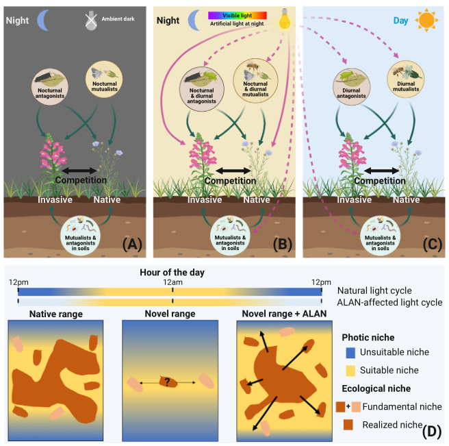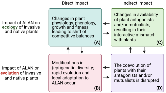 圖1夜間人造燈光(ALAN)對入侵植物和本地植物的直接和間接影響