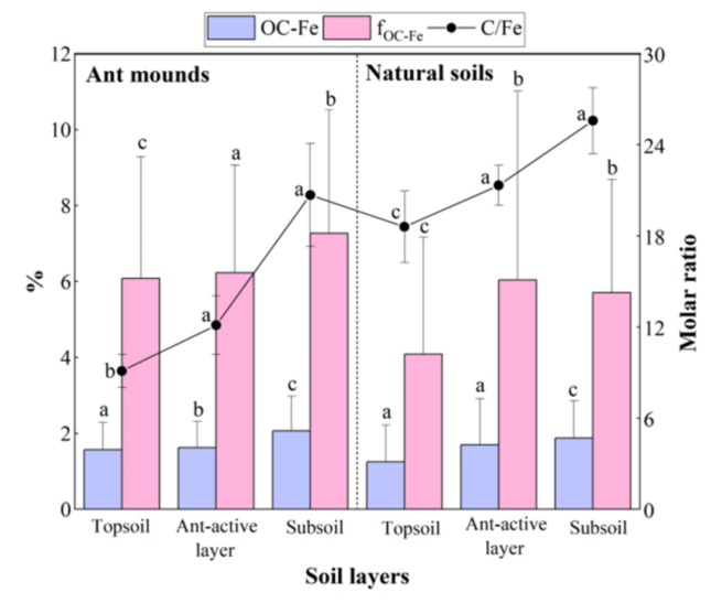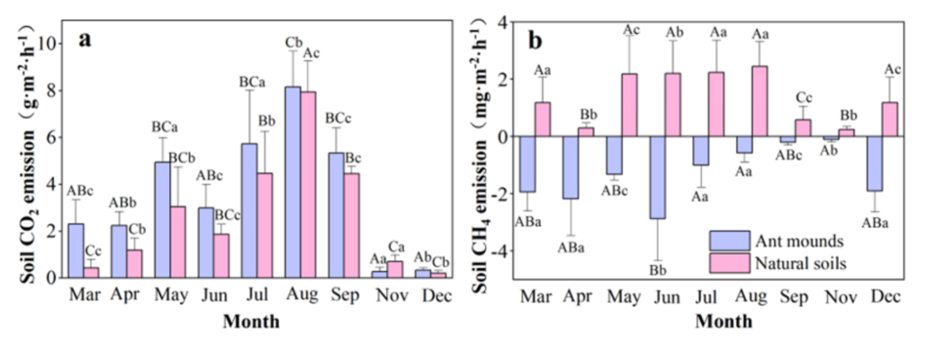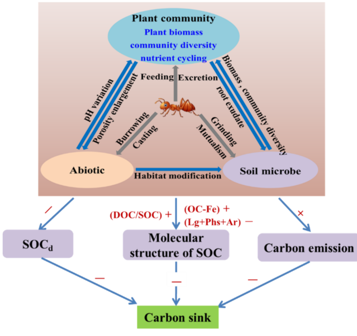 研究結(jié)果表明:螞蟻入侵顯著降低了土壤的有機(jī)碳密度和儲量。螞蟻丘CO2排放量顯著高于對照土,蟻丘為CO2的源,但是同時也是CH4的匯。蟻丘土壤中代表土壤活性碳庫的組分占比顯著增高,代表化學(xué)保護(hù)作用機(jī)制的礦物有機(jī)碳復(fù)合體含量增高,熱裂解化合物中不易分解的惰性組分占比顯著降低。