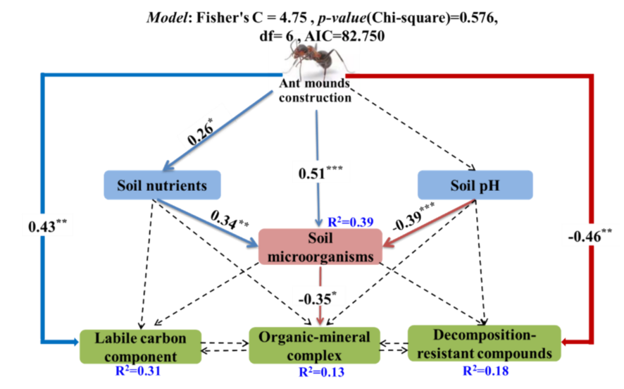 螞蟻對土壤惰性碳庫和活性碳庫均存在直接影響,螞蟻擾動對活性碳庫有直接促進(jìn)作用,對土壤惰性碳庫存在顯著的負(fù)影響。螞蟻能夠促進(jìn)土壤營養(yǎng)成分的富集,從而對土壤微生物豐度及活性產(chǎn)生促進(jìn)作用。同時,土壤pH值的改變還會對微生物產(chǎn)生一定程度的抑制效應(yīng)。螞蟻活動本身也會直接促進(jìn)微生物生長繁殖。各環(huán)境因子和微生物因子對土壤活性和惰性碳庫的效應(yīng)并未表現(xiàn)出顯著性。