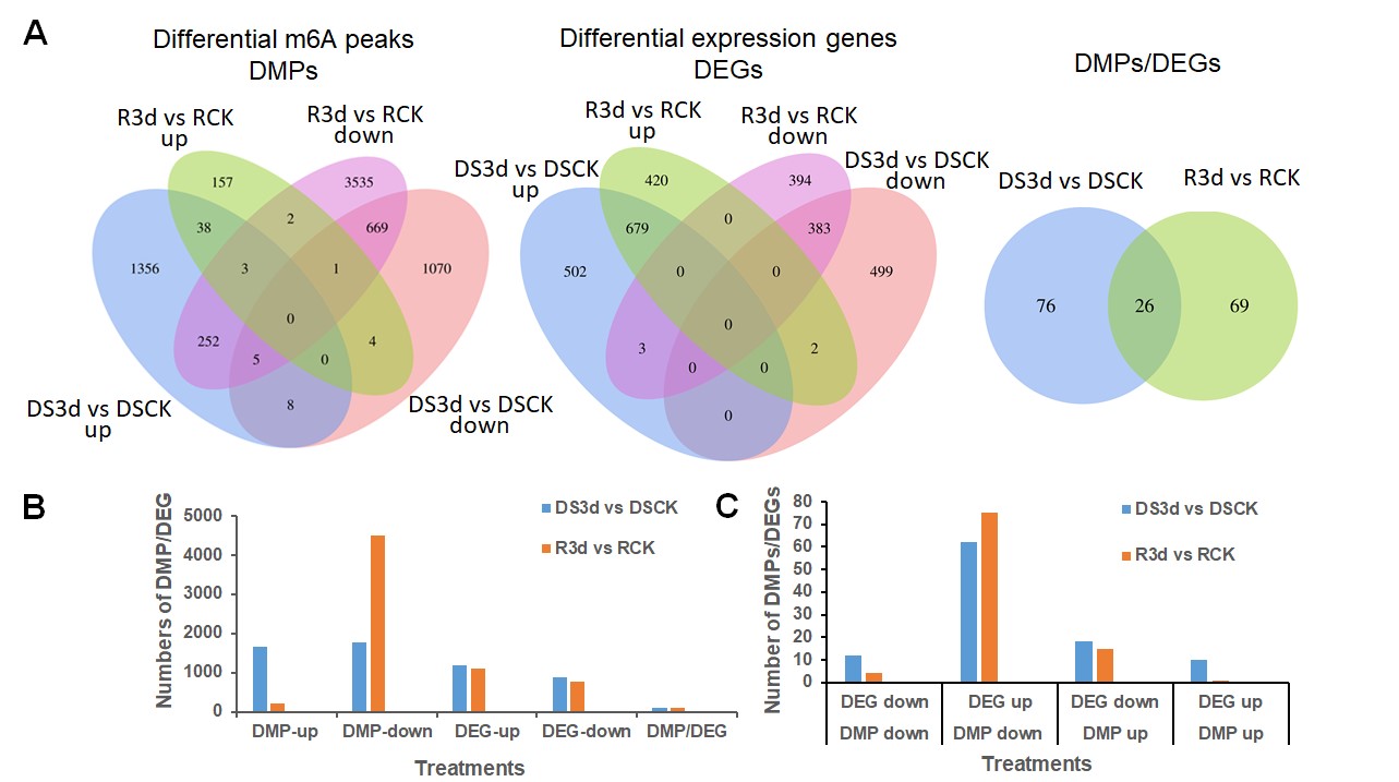 圖1 抗感大豆品種在SCN侵染3d后的m6A甲基化峰(DMPs)和基因表達(dá)(DEGs)的差異