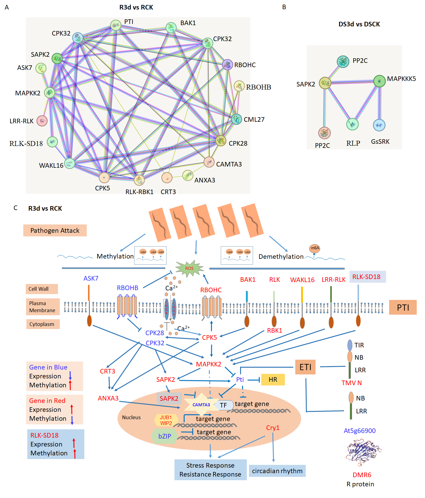 近日,東北地理所農(nóng)田有害生物學(xué)科組李春杰研究團(tuán)隊采用先進(jìn)的m6A測序和RNA測序技術(shù),探討了m6A修飾對基因表達(dá)和植物防御反應(yīng)的影響。通過對大豆高抗品種和高感品種的對比研究,明確了m6A甲基化在大豆孢囊線蟲病抗感基因型中的分布及動態(tài)變化。結(jié)果表明,大豆孢囊線蟲侵染高抗品種后,上調(diào)和下調(diào)差異m6A峰(DMPs)的比例是1:22(205:4495);而在感病品種中,其比例接近1:1(1662:1774)(圖1)。該結(jié)果說明SCN的4號生理小種侵染抗病種質(zhì)后能夠抑制大豆m6A甲基化修飾。結(jié)合轉(zhuǎn)錄組分析差異表達(dá)基因(DEGs)發(fā)現(xiàn),關(guān)鍵的抗性和防御相關(guān)基因顯示出上調(diào)表達(dá)和甲基化被抑制,包括抗性R基因、受體激酶和轉(zhuǎn)錄因子等重要調(diào)控元件。相反,在高感品種中,與感病性相關(guān)基因的表達(dá)增加且甲基化減少,包括霉菌位點(diǎn)O樣蛋白(MLO)和影響防御機(jī)制的調(diào)控元件。通過對重疊的DMPs/DEGs基因的GO/KEGG富集分析,結(jié)合蛋白質(zhì)-蛋白質(zhì)相互作用,構(gòu)建了抗病反應(yīng)中的關(guān)鍵調(diào)控網(wǎng)絡(luò)模型(圖2)。在抗病品種中,有19個DMPs/DEGs互作,而感病品種中只有6個DMPs/DEGs互作。在抗病反應(yīng)中,SCN侵染抑制了甲基化反應(yīng),卻促進(jìn)了與細(xì)胞受體激酶相關(guān)基因和抗性基因的表達(dá)。該調(diào)控網(wǎng)絡(luò)模型(圖2)揭示了SCN侵染能夠抑制大豆m6A甲基化修飾,從而提高SCN防御相關(guān)膜受體和抗性基因的表達(dá)。甲基化模式與基因表達(dá)之間的動態(tài)相關(guān)性進(jìn)一步解釋了大豆對SCN的抗感機(jī)制。此外,研究還揭示了m6A修飾、可變剪接、microRNA和基因調(diào)控之間的復(fù)雜相互作用可能共同調(diào)控大豆的抗感反應(yīng)。以上研究結(jié)果不僅有助于深入理解植物-線蟲互作機(jī)制,還為開發(fā)新的線蟲防控策略提供了重要的理論基礎(chǔ)。