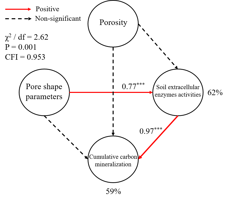 圖2 孔隙分布和形狀參數(shù)通過直接和間接途徑影響累積有機(jī)碳礦化的結(jié)構(gòu)方程模型。箭頭上的數(shù)值表示標(biāo)準(zhǔn)化路徑系數(shù)。紅色箭頭表示正相關(guān)關(guān)系。路徑的顯著性表示為:*代表p < 0.05;**代表p < 0.01;***代表p < 0.001,黑色虛線代表路徑不顯著。R2值代表自變量對(duì)因變量變異的解釋程度。