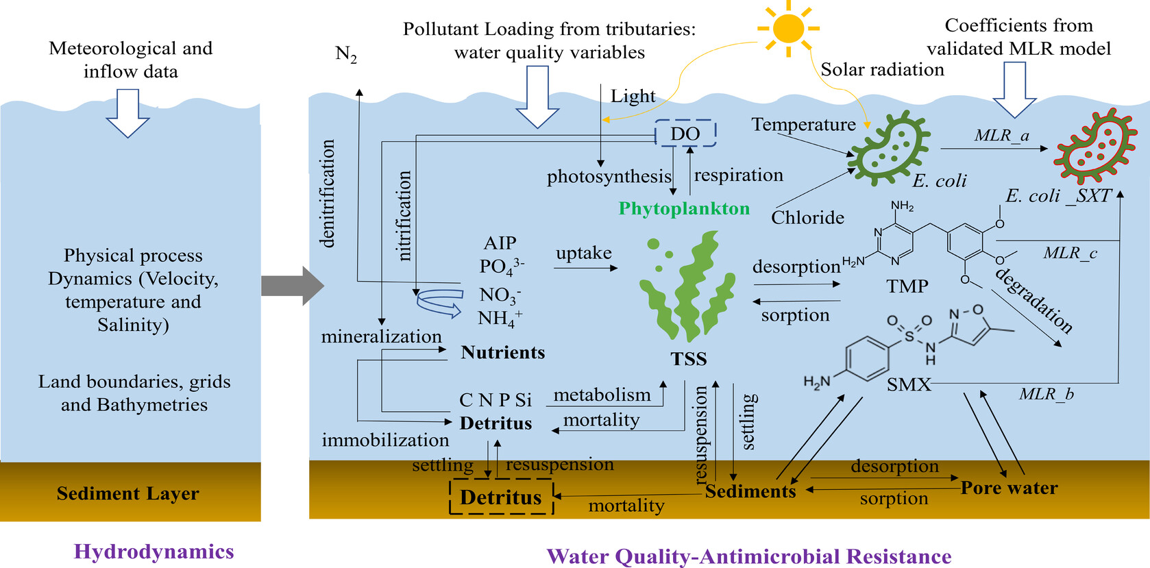 水生環(huán)境中微生物對抗生素的耐藥性(AMR)日益增加,已被世界衛(wèi)生組織列為人類面臨的十大全球公共衛(wèi)生威脅之一。因此,迫切需要建立和量化水生環(huán)境中抗生素和相關(guān)耐藥性風(fēng)險(xiǎn)。中國科學(xué)院東北地理所張敬杰研究員參與并指導(dǎo)構(gòu)建了綜合建模框架,預(yù)測抗生素、大腸桿菌及其相關(guān)耐藥菌株(ARB)的時(shí)空分布,用于識別AMR熱點(diǎn),評估抗生素在水生環(huán)境中的潛在環(huán)境風(fēng)險(xiǎn)。本研究對兩種具有代表性的抗生素(SMX和TMP)、指示菌(大腸桿菌)及其相關(guān)的ARB(EC_SXT)進(jìn)行了建模。風(fēng)險(xiǎn)評估表明,預(yù)測的TMP比SMX具有更高的AMR風(fēng)險(xiǎn),但SMX具有更高的生態(tài)風(fēng)險(xiǎn)。該研究提出了一個(gè)混合建模框架,將統(tǒng)計(jì)模型與水動(dòng)力水質(zhì)模型結(jié)合起來,以整體的方式預(yù)測AMR,從而促進(jìn)更好的風(fēng)險(xiǎn)管理發(fā)展。