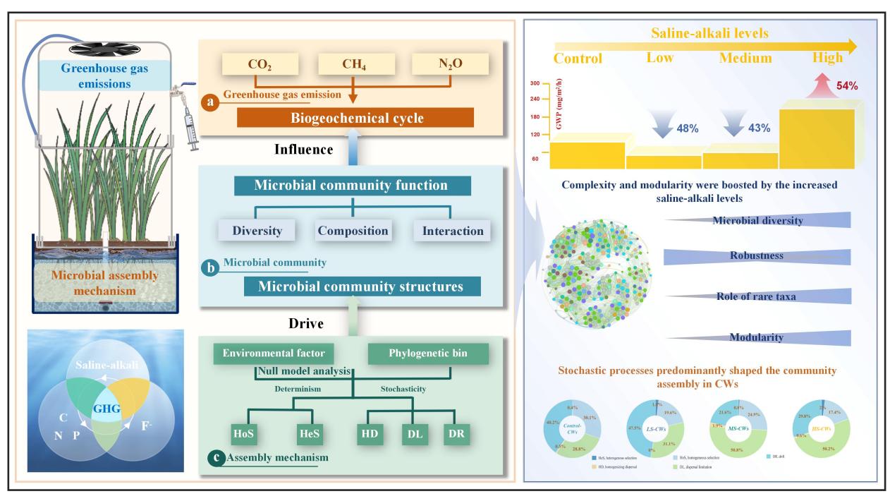 為解決上述問題,中國科學(xué)院東北地理與農(nóng)業(yè)生態(tài)研究所水環(huán)境污染與防治研究團(tuán)隊(duì)通過人工濕地生態(tài)模擬實(shí)驗(yàn),開展了鹽堿與氟離子雙重脅迫下人工濕地中碳、氮和磷遷移轉(zhuǎn)化及微生物學(xué)機(jī)制研究。研究表明,與非鹽堿的對(duì)照處理組比較,不同程度鹽堿與氟離子脅迫均降低了人工濕地對(duì)COD、TN和TP的去除效率,但中、低鹽堿處理組仍具有較強(qiáng)的水質(zhì)凈化能力。人工濕地對(duì)氟離子的去除率隨著鹽堿程度的增加逐漸降低,最終的去除率在22.1% ~ 66.5%。高鹽堿人工濕地處理組具有更強(qiáng)的溫室效應(yīng),其全球增溫潛勢(shì)(GWP)分別是對(duì)照組、低鹽堿和中鹽堿處理組的2.2倍、4.2倍和3.9倍。微生物組裝分析表明,隨機(jī)過程中的漂移和擴(kuò)散限制主導(dǎo)了人工濕地的微生物群落組裝過程,鹽堿水平的升高可能會(huì)增強(qiáng)微生物棲息地的分化,增加擴(kuò)散限制在群落構(gòu)建中的貢獻(xiàn),同時(shí)提高共生網(wǎng)絡(luò)的模塊化和復(fù)雜性。這可能是微生物群落抵抗環(huán)境壓力和維持網(wǎng)絡(luò)穩(wěn)定性的一種策略。