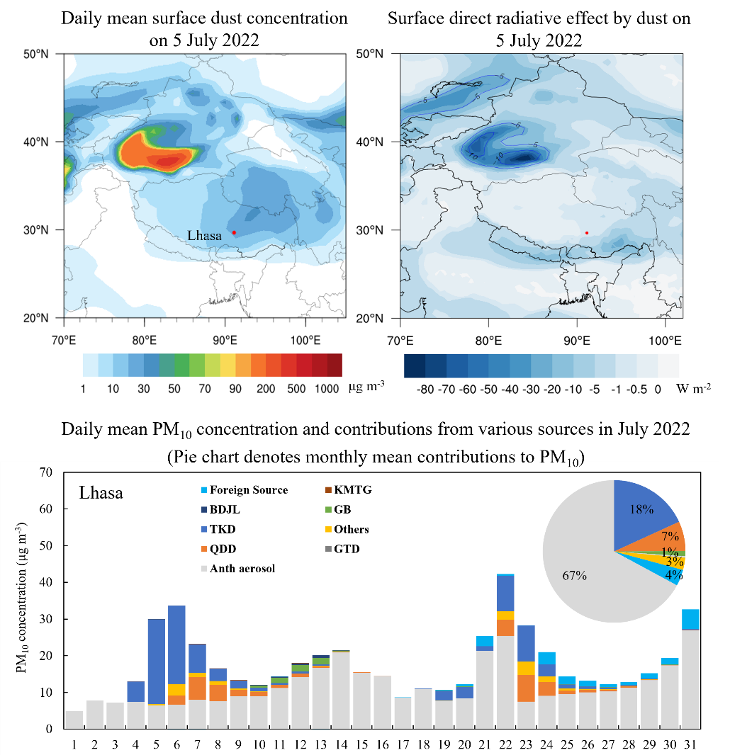 沙塵氣溶膠是大氣氣溶膠最主要成分之一,主要來源于沙漠、干旱及半干旱地區(qū)地表風(fēng)蝕、土壤再懸浮以及農(nóng)業(yè)和工業(yè)活動等。中國西北地區(qū)擁有中國80%的沙漠,其中塔克拉瑪干沙漠作為世界第二大沙漠,緊鄰青藏高原。青藏高原作為“世界第三極”,對大氣環(huán)流和氣候有重要的影響。然而,目前關(guān)于塔克拉瑪干等沙漠的沙塵如何影響青藏高原地區(qū)尚不清楚,而且對夏季沙塵氣溶膠的關(guān)注較少。