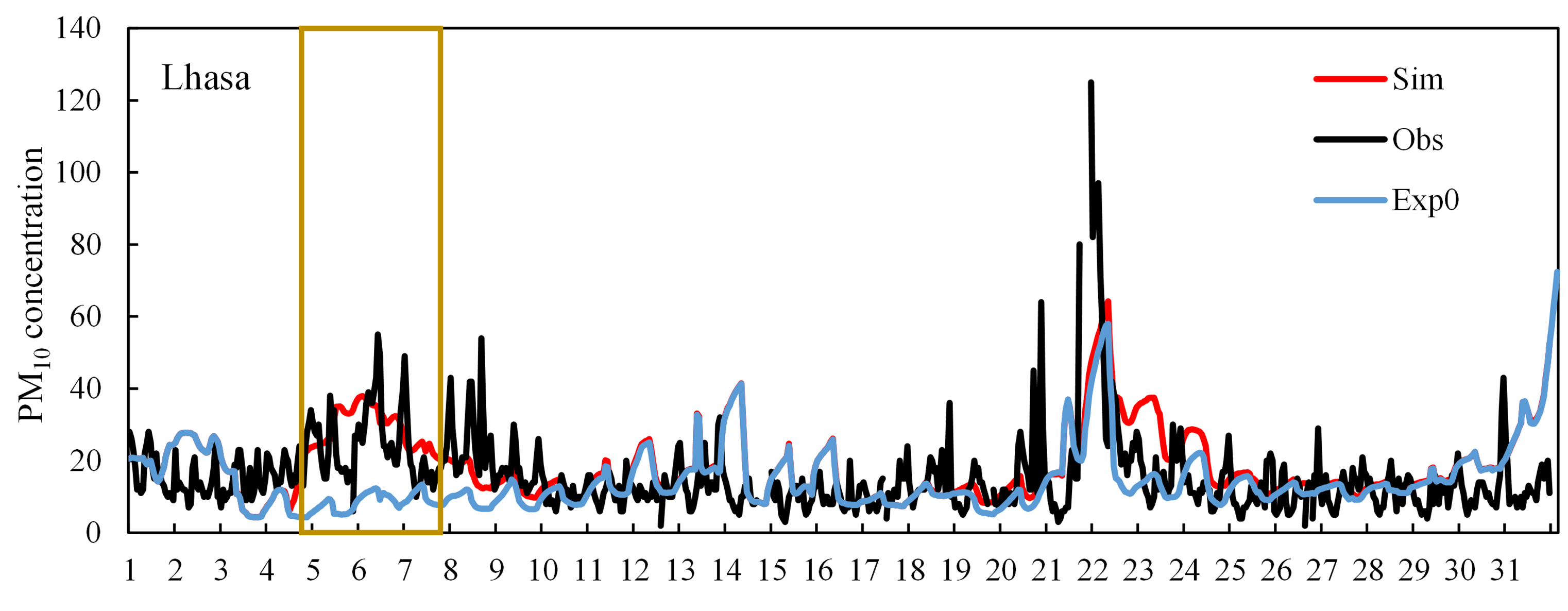 圖1 2022年7月拉薩地區(qū)逐時PM10濃度模擬和觀測值(Exp0為不考慮塔克拉瑪干沙漠起沙的模擬結(jié)果)