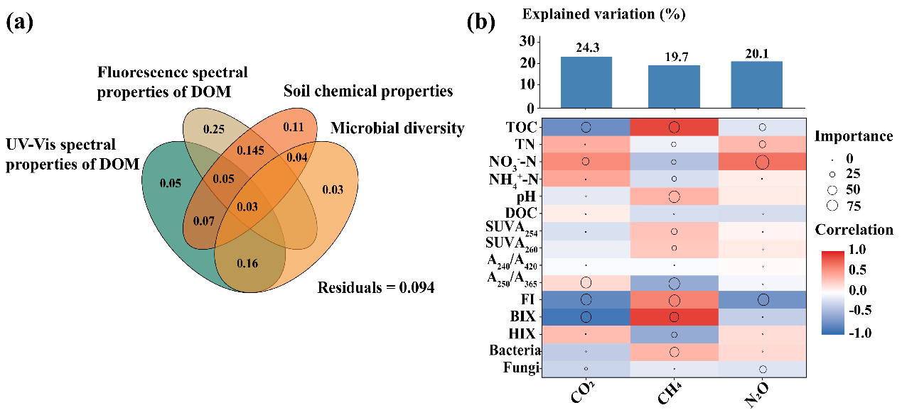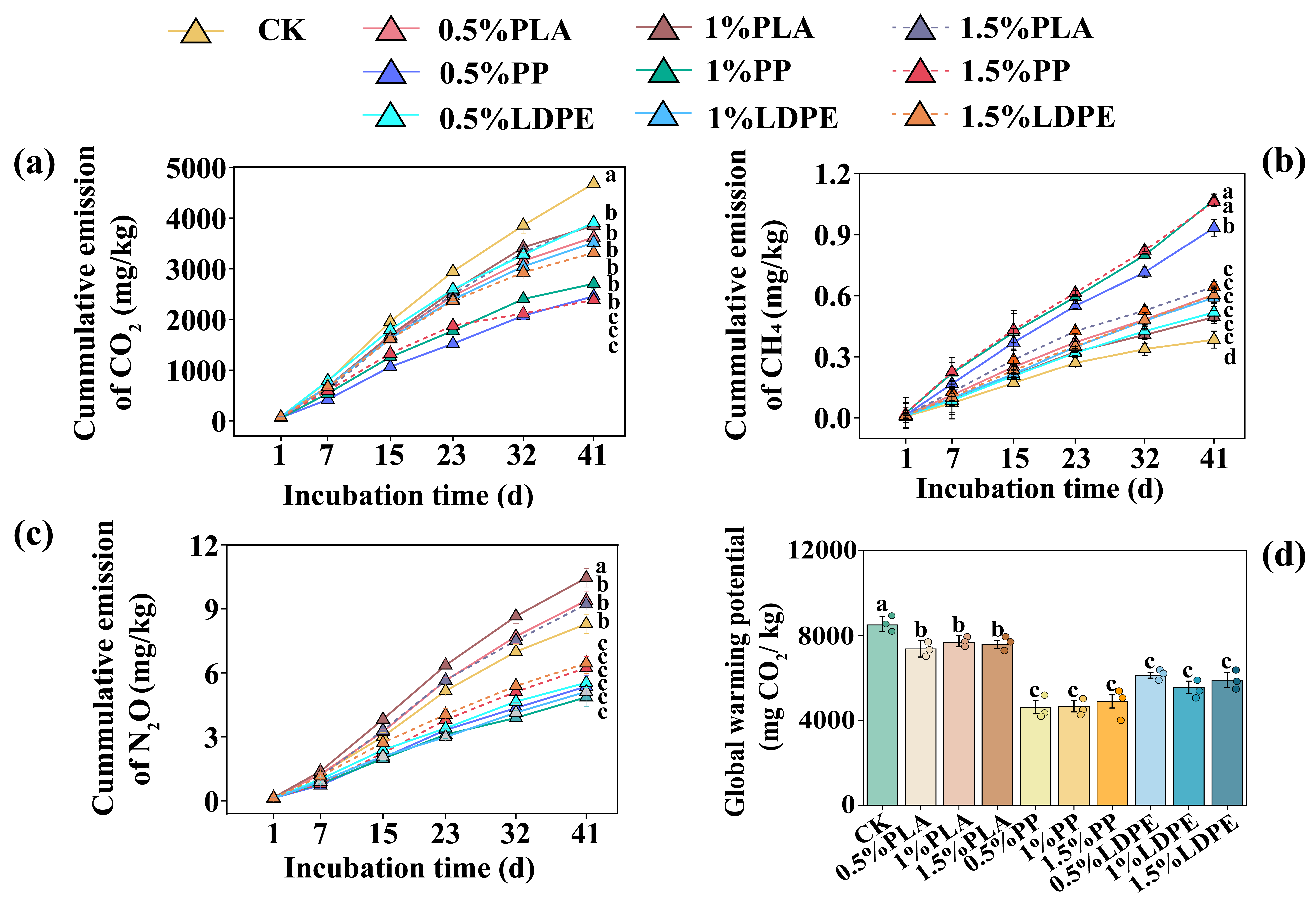 結(jié)果表明,不同類型的微塑料添加均顯著提高了土壤的碳養(yǎng)分與pH,但對土壤氮養(yǎng)分與DOM的化學(xué)多樣性的影響存在差異。三種微塑料添加均有效抑制了土壤CO2的累計排放量,其中低密度聚乙烯與聚丙烯添加能夠顯著抑制土壤N2O排放,降低全球增溫潛勢。DOM熒光特性、土壤化學(xué)性質(zhì)和微生物多樣性指數(shù)是解釋溫室氣體排放的關(guān)鍵指標(biāo)。