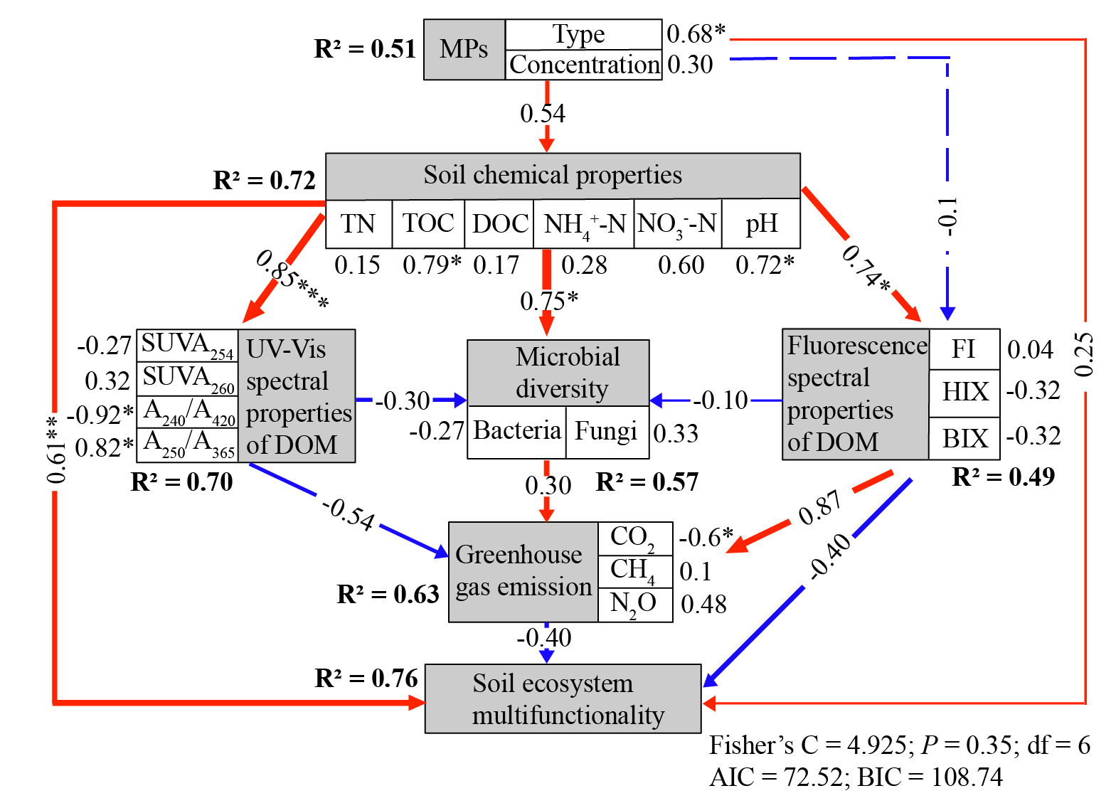 微塑料對土壤生態(tài)系統(tǒng)多功能性的影響取決于其聚合物類型和添加劑量,而土壤TOC、pH、DOM的A240/A420和A250/A365指數(shù)以及CO2排放是評估微塑料對土壤生態(tài)系統(tǒng)多功能性影響的重要指標(biāo)。