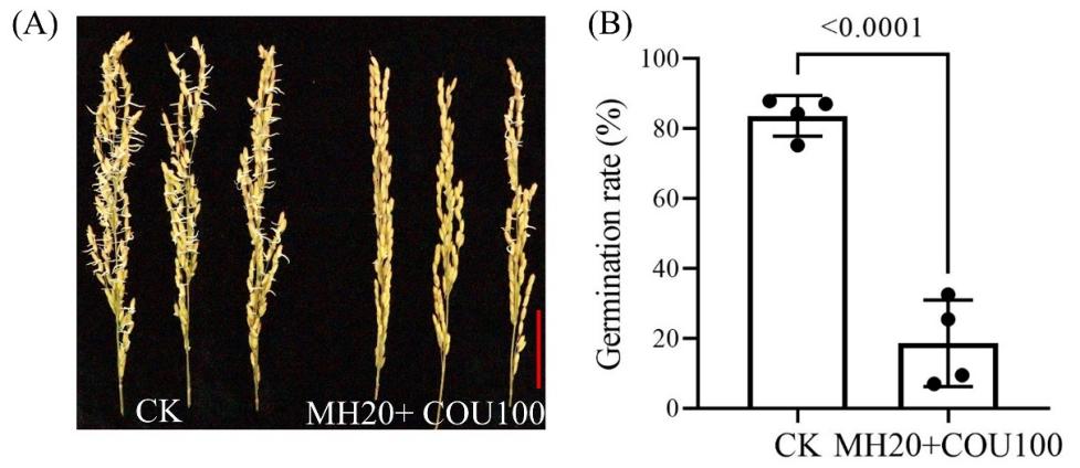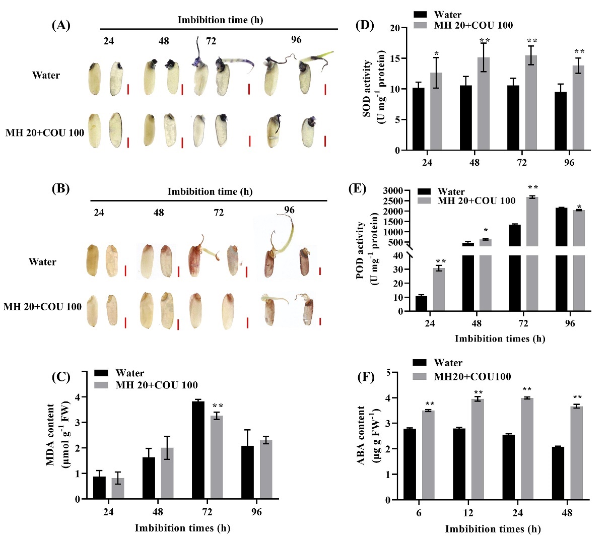 研究團(tuán)隊(duì)通過(guò)連續(xù)和短期浸種實(shí)驗(yàn),從馬來(lái)酰肼(MH)、香豆素(COU)和丁香酚(EUG)三種穗發(fā)芽抑制劑中篩選出穗發(fā)芽抑制劑的最佳組合為MH 20 mg L-1 + COU 100 mg L-1,該組合可顯著降低水稻種子發(fā)芽率。進(jìn)一步研究表明,該組合處理顯著降低了種子萌發(fā)過(guò)程中的α-淀粉酶活性,減少了可溶性糖和可溶性蛋白的含量,從而抑制了種子萌發(fā)所需的能量和物質(zhì)供應(yīng)。該組合還能調(diào)節(jié)抗氧化酶活性,抑制活性氧(ROS)的積累,減少MDA的產(chǎn)生;促進(jìn)種子內(nèi)ABA含量快速積累(圖1)。基因表達(dá)分析表明,MH和COU組合通過(guò)調(diào)節(jié)OsNCED1/2/5和OsABA8ox1-3表達(dá),精準(zhǔn)調(diào)節(jié)水稻種子內(nèi)ABA的含量。在不同萌發(fā)階段,該組合對(duì)ROS產(chǎn)生基因OsRbohs表達(dá)的調(diào)節(jié)不同,還下調(diào)了α-淀粉酶基因(OsAmy1A和OsAmy3D)的表達(dá)。體外模擬萌發(fā)試驗(yàn)進(jìn)一步證實(shí)該PHS抑制劑組合能夠有效降低種子萌發(fā)(圖2)。