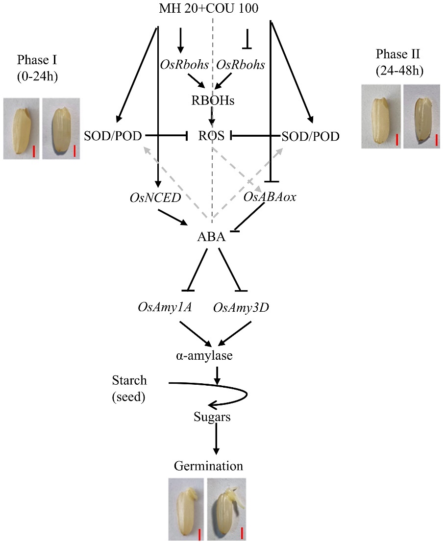 該研究首次報(bào)道了MH和COU復(fù)配對(duì)水稻種子萌發(fā)的協(xié)同抑制作用,揭示了其抑制水稻種子萌發(fā)的機(jī)制,涉及ROS積累、ABA代謝和淀粉降解等多個(gè)生理過(guò)程,并繪制了相應(yīng)的機(jī)制模型(圖3),研究成果不僅加深了對(duì)PHS抑制劑調(diào)控種子萌發(fā)機(jī)制的理解,也為MH和COU在防止穗發(fā)芽的應(yīng)用中提供了理論支持,有望在農(nóng)業(yè)生產(chǎn)中得到廣泛應(yīng)用。