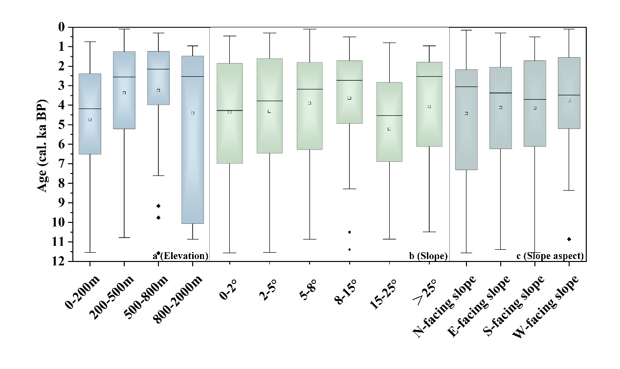 圖1?全新世東北地區(qū)泥炭沼澤在不同海拔、坡度和坡向地形下形成時間