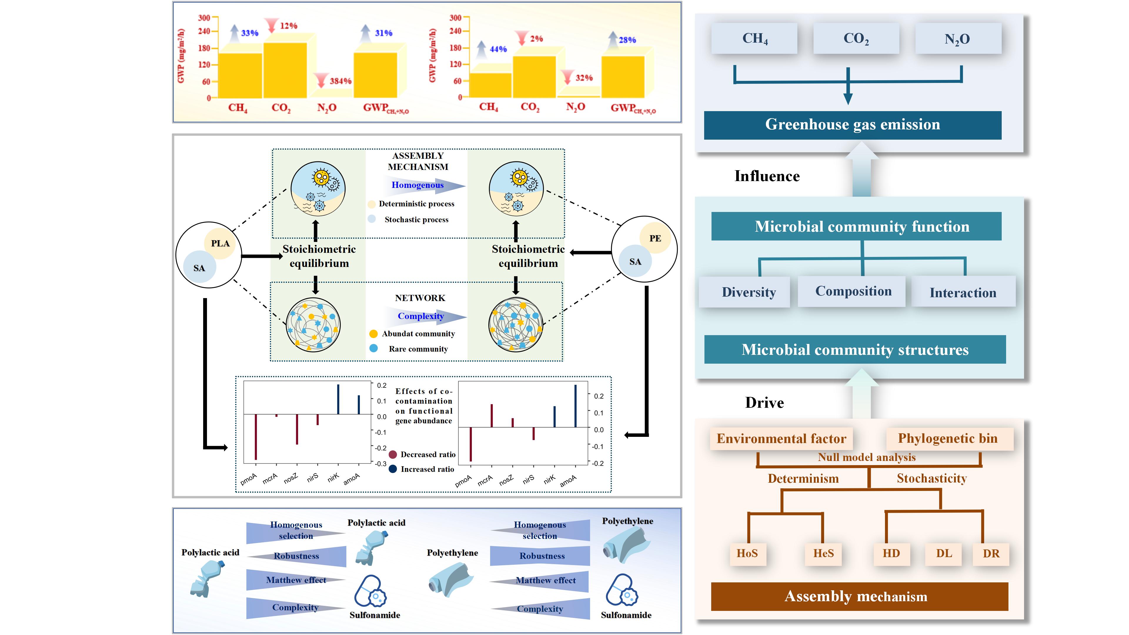 為解決上述問題,中國科學(xué)院東北地理與農(nóng)業(yè)生態(tài)研究所水環(huán)境污染與防治研究團(tuán)隊(duì)通過微宇宙模擬實(shí)驗(yàn),探究了不同微塑料(傳統(tǒng)微塑料聚乙烯(PE)、可生物降解微塑料聚乳酸(PLA))和磺胺類抗生素(SA)在單一暴露以及復(fù)合暴露條件下,對農(nóng)業(yè)溝渠沉積物溫室氣體(CH4、CO2和N2O)排放特征的影響,并初步揭示了其潛在的微生物學(xué)機(jī)制。研究結(jié)果顯示,不同處理下溝渠沉積物全球增溫潛勢值(GWP)依次為:SA+PLA (162.96 mg/m2/h) > PLA (123.49 mg/m2/h) > SA (121.75 mg/m2/h) > SA+PE (102.33 mg/m2/h) > CK (84.67 mg/m2/h) > PE (78.29 mg/m2/h)。這一研究結(jié)果證明SA與PLA的復(fù)合污染將導(dǎo)致溝渠沉積物溫室效應(yīng)加劇。微生物組裝和分子生態(tài)網(wǎng)絡(luò)分析表明,SA引起的選擇性壓力降低了沉積物中群落組分更替,而微塑料則增強(qiáng)了漂移過程的相對重要性,并降低了微生物網(wǎng)絡(luò)的魯棒性。由于SA和PLA的復(fù)合污染促進(jìn)了稀有物種的定殖,其對微生物網(wǎng)絡(luò)和組裝過程的影響與SA和PE復(fù)合污染的結(jié)果相反。