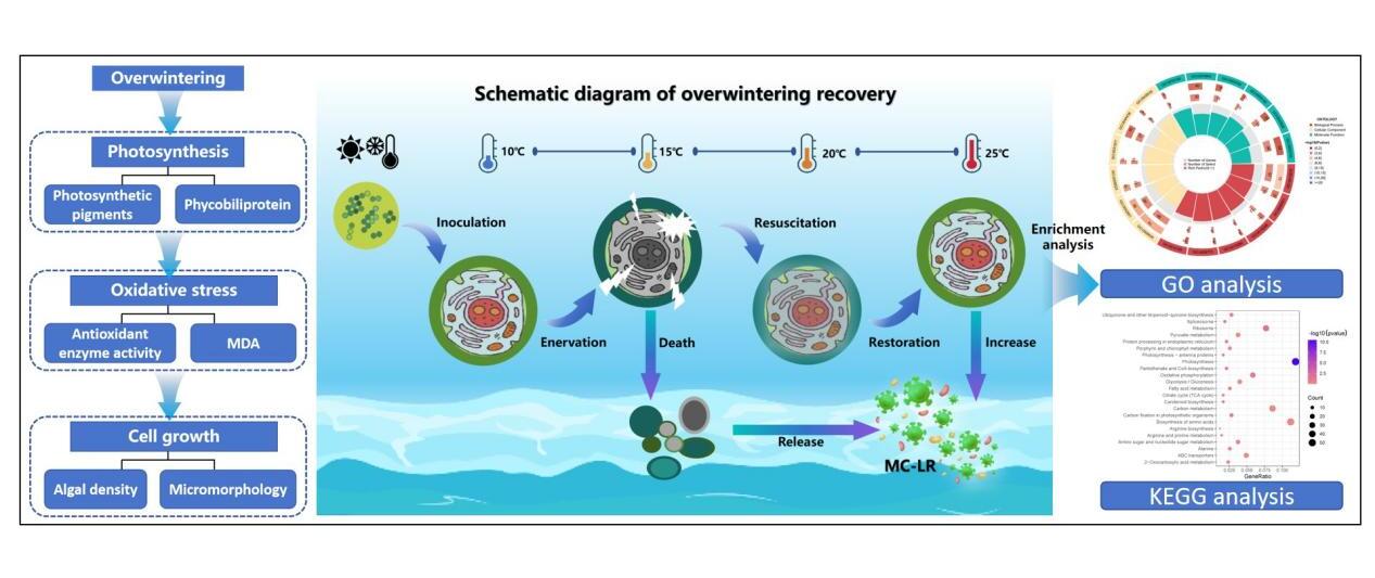 為探索上述科學(xué)問題,中國科學(xué)院東北地理與農(nóng)業(yè)生態(tài)研究所水環(huán)境污染與防治研究團(tuán)隊(duì)以最為常見的有毒藍(lán)藻—銅綠微囊藻(M.aeruginosa)為研究對(duì)象,模擬研究了藻體在越冬休眠后隨環(huán)境溫度升高的動(dòng)態(tài)復(fù)蘇過程。研究結(jié)果表明,隨環(huán)境溫度的逐步上升,越冬(4℃低溫及黑暗條件下休眠12天后,由10℃逐步上升至25℃)和非越冬處理組(直接由10℃上升至25℃)的藻密度均呈先下降(10-15℃區(qū)間)后上升(15-25℃區(qū)間)的變化趨勢(shì)。在整個(gè)培養(yǎng)期間,越冬處理組的藻密度始終低于非越冬處理組,當(dāng)培養(yǎng)實(shí)驗(yàn)結(jié)束時(shí),越冬處理組的藻密度相較于非越冬處理組降低了55.6%。在環(huán)境溫度為10-15℃區(qū)間時(shí),越冬處理抑制了藻體光合效率和微囊藻毒素(MC-LR)的產(chǎn)生,激活了抗氧化系統(tǒng),破壞了細(xì)胞超微結(jié)構(gòu),導(dǎo)致部分細(xì)胞死亡;隨著環(huán)境溫度上升至20-25℃區(qū)間,藻體迅速增殖,光合效率升高,部分受損的細(xì)胞結(jié)構(gòu)也逐漸恢復(fù)。基于信號(hào)通路分析得出,越冬處理下調(diào)了與光合作用、核糖體、卡爾文循環(huán)和氧化磷酸化相關(guān)的基因表達(dá),從而阻礙了M. aeruginosa的生長和代謝能力。