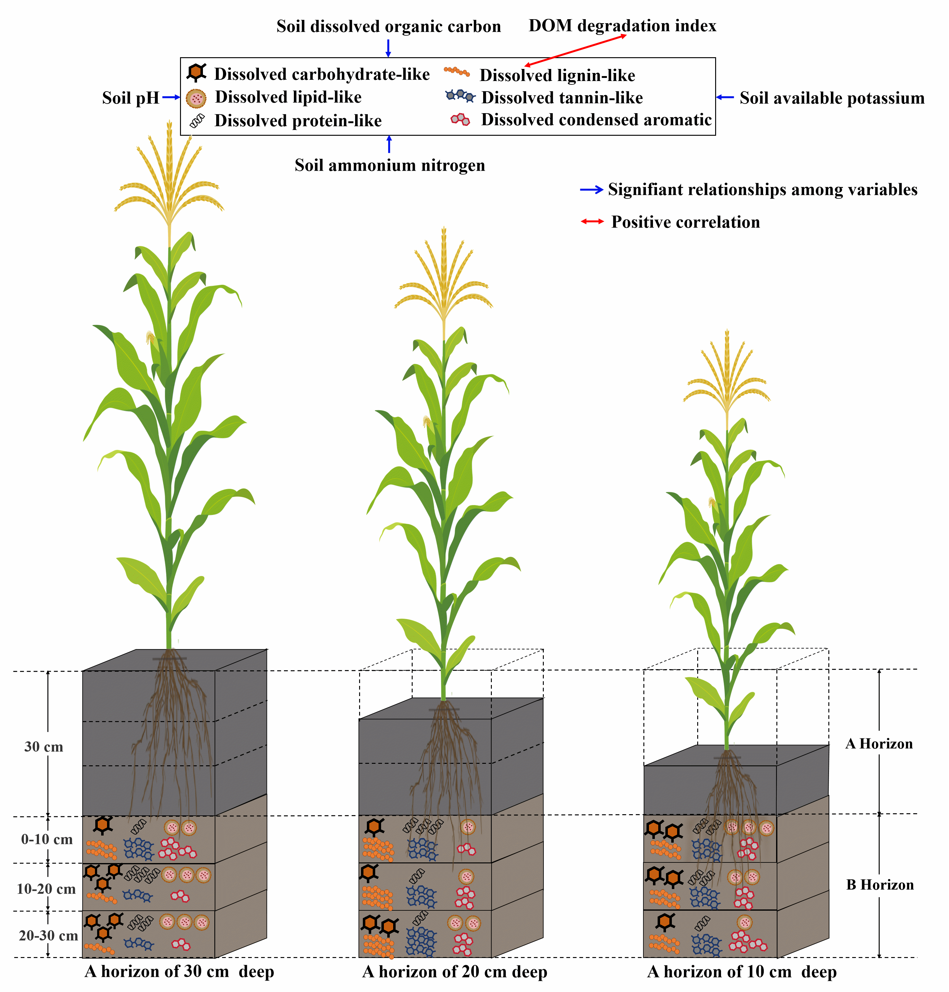土壤溶解性有機(jī)質(zhì)(DOM)化學(xué)多樣性是指土壤中DOM分子的化學(xué)組成和性質(zhì)的多樣性。土壤侵蝕導(dǎo)致的亞耕層(B層)暴露會(huì)顯著影響土壤的含水量、pH值和養(yǎng)分有效性等,進(jìn)而對(duì)DOM的動(dòng)態(tài)變化產(chǎn)生影響。了解侵蝕土壤中影響DOM化學(xué)多樣性的具體因素,對(duì)于預(yù)測(cè)在這些變化條件下DOM和土壤有機(jī)質(zhì)(SOM)的反應(yīng)性和動(dòng)態(tài)至關(guān)重要。因此,明晰不同侵蝕程度下0-10、10-20和20-30 cmB層中的DOM化學(xué)多樣性的變化情況及其DOM的降解程度,探究影響B(tài)層DOM化學(xué)多樣性變化的關(guān)鍵因素,將有助于加深對(duì)土壤中DOM分子持久性和多樣性的認(rèn)識(shí),從而促進(jìn)對(duì)侵蝕土壤中碳循環(huán)的預(yù)測(cè)。