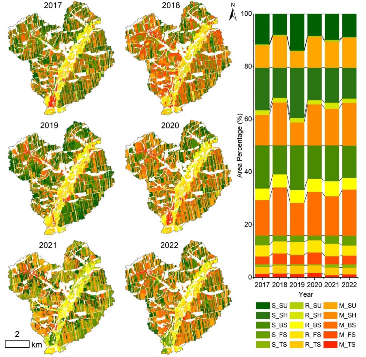 圖2. 2017-2022年流域不同景觀位置上不同作物的格局分布和比例(S:大豆,R:水稻,M:玉米;SU:坡頂,SH:坡肩,BS:坡腰,FS:坡腳,TS:坡趾)