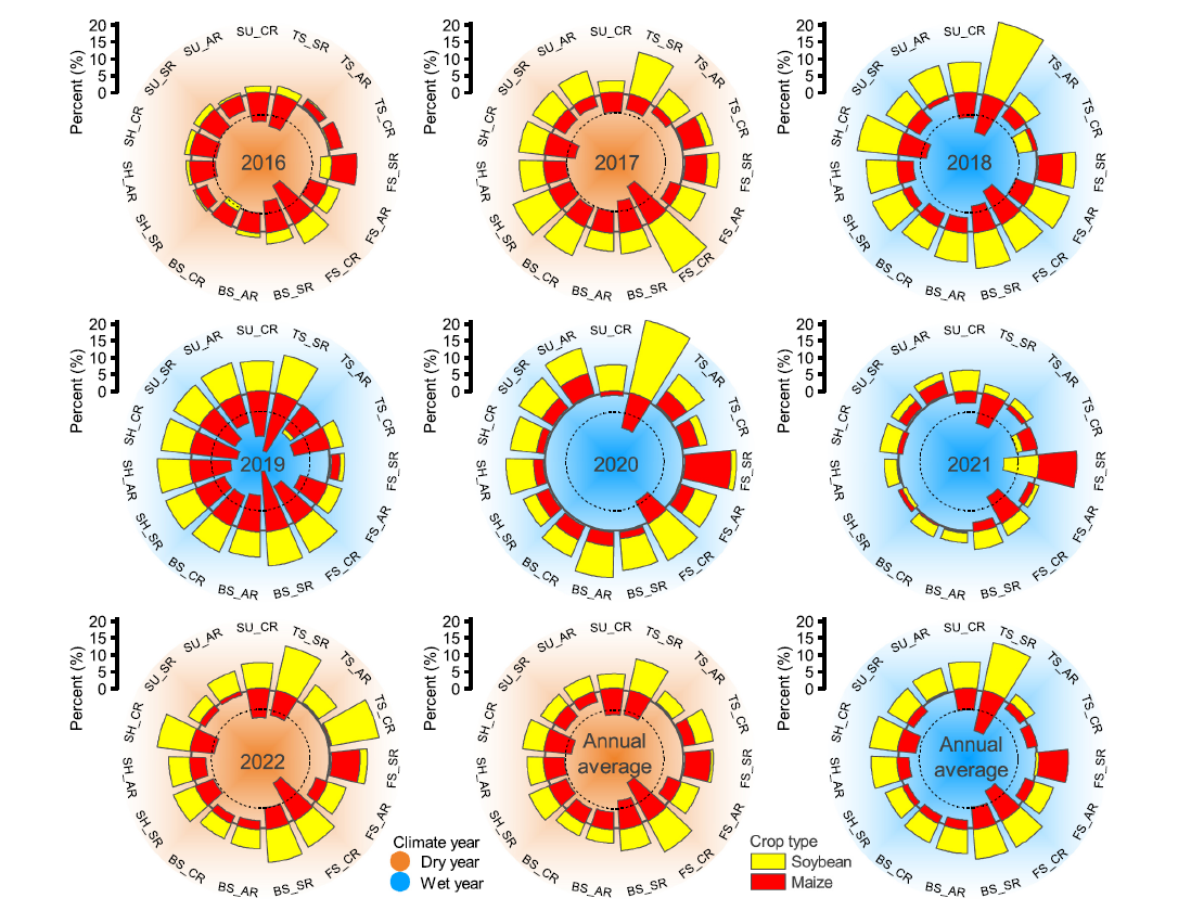 研究團(tuán)隊(duì)在農(nóng)藝景觀理論的基礎(chǔ)上建立了一個(gè)流域尺度上農(nóng)藝景觀對(duì)耕地產(chǎn)能及氣候適應(yīng)性的評(píng)價(jià)體系,分析了不同農(nóng)藝景觀下農(nóng)田生產(chǎn)力的分布特征及其在不同氣候年份下的差異,系統(tǒng)總結(jié)了有利于(或不利于)適應(yīng)不同氣候條件的農(nóng)藝景觀格局。研究發(fā)現(xiàn),低景觀位置橫壟主導(dǎo)下的農(nóng)藝景觀生產(chǎn)力最低,不同作物鑲嵌下的農(nóng)藝景觀格局類型具有不同的分布規(guī)律,玉米鑲嵌的農(nóng)藝景觀生產(chǎn)力從低景觀位置到高景觀位置呈直線增長規(guī)律,而大豆鑲嵌的農(nóng)藝景觀生產(chǎn)力從低景觀位置到高景觀位置呈現(xiàn)峰型分布規(guī)律。針對(duì)農(nóng)藝景觀的氣候適應(yīng)性而言,總體來講,玉米鑲嵌于坡腳豎壟下的農(nóng)藝景觀對(duì)干旱和濕潤均具有較高的適應(yīng)性,大豆鑲嵌于坡趾豎壟下的農(nóng)藝景觀對(duì)兩種氣候條件具有較高的適應(yīng)性(圖3)。