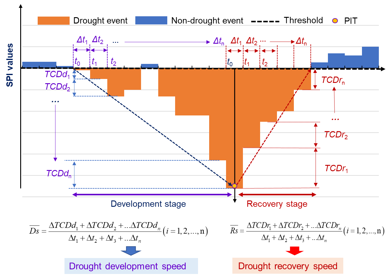 氣候變化引起干旱頻發(fā)和強(qiáng)度增強(qiáng),并呈現(xiàn)爆發(fā)速度加快的趨勢(shì),對(duì)全球水安全、糧食安全和生態(tài)安全產(chǎn)生深遠(yuǎn)的影響。干旱演化速度在很大程度上決定了干旱的持續(xù)時(shí)間、強(qiáng)度、嚴(yán)重性及其致災(zāi)性,因而成為近年來(lái)氣象水文學(xué)領(lǐng)域研究的熱點(diǎn)和前沿。然而,已有研究多關(guān)注單一干旱類型的時(shí)空演變特征及多類型干旱之間的傳播過(guò)程,缺少?gòu)母珊凳录?nèi)在過(guò)程(發(fā)展過(guò)程和恢復(fù)過(guò)程)視角對(duì)干旱演化速度的認(rèn)識(shí),給干旱監(jiān)測(cè)、風(fēng)險(xiǎn)預(yù)估與有效應(yīng)對(duì)帶來(lái)諸多挑戰(zhàn)。