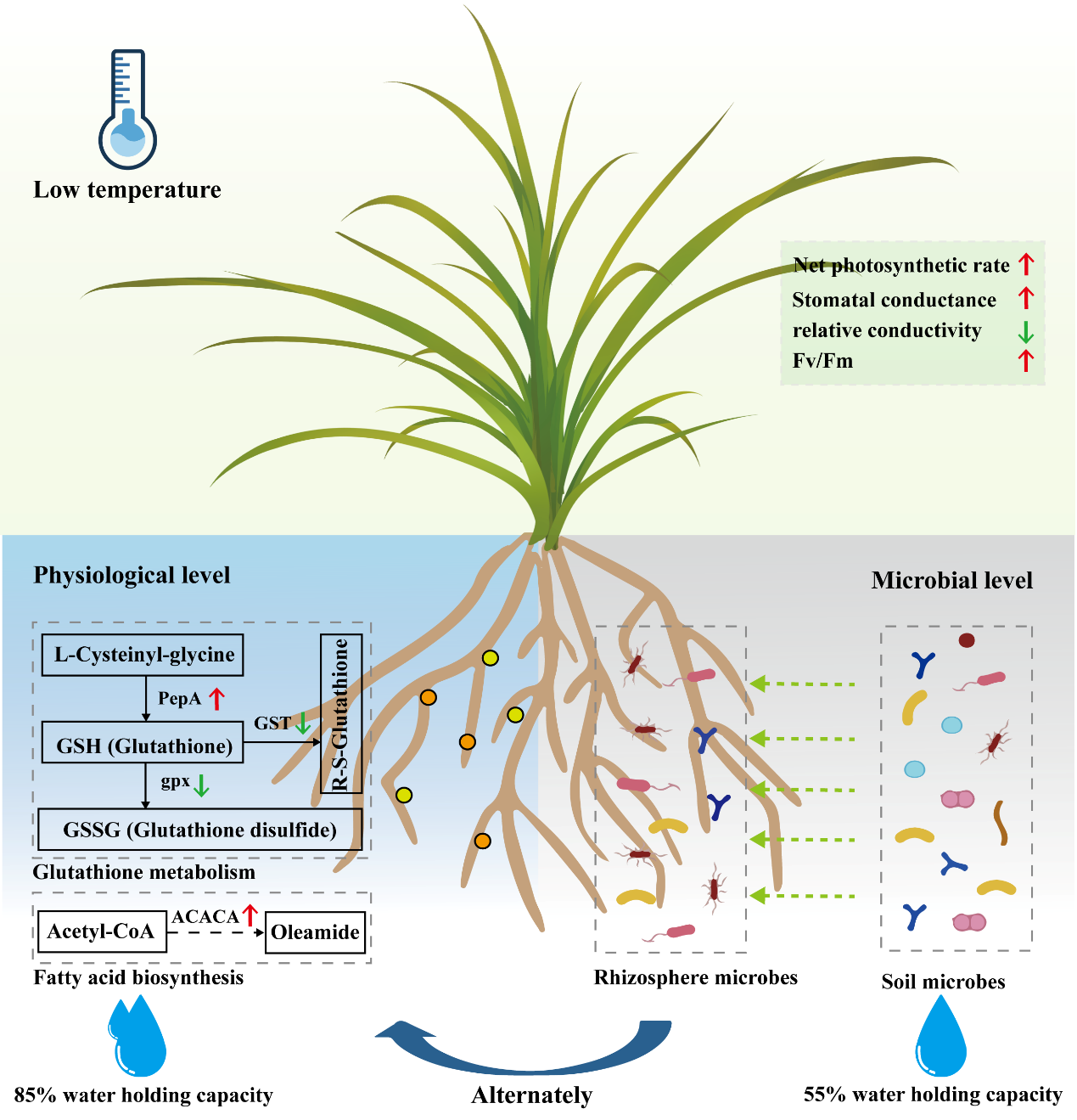 低溫導致作物植株細胞膜通透性改變、限制光合碳同化能力,對作物生產(chǎn)造成極大影響。根際微生物通過代謝調(diào)節(jié)、細菌細胞外多糖產(chǎn)生、抗氧化防御和促進根系生長等方式幫助作物應對環(huán)境脅迫。分根區(qū)干旱灌溉已被廣泛用于調(diào)節(jié)作物根系發(fā)育和緩解環(huán)境脅迫,但現(xiàn)有的研究主要關(guān)注干旱和鹽脅迫下作物的生理機制,對灌溉誘導的根系代謝和根際微生物組的改變?nèi)绾未龠M低溫抗性的見解有限。