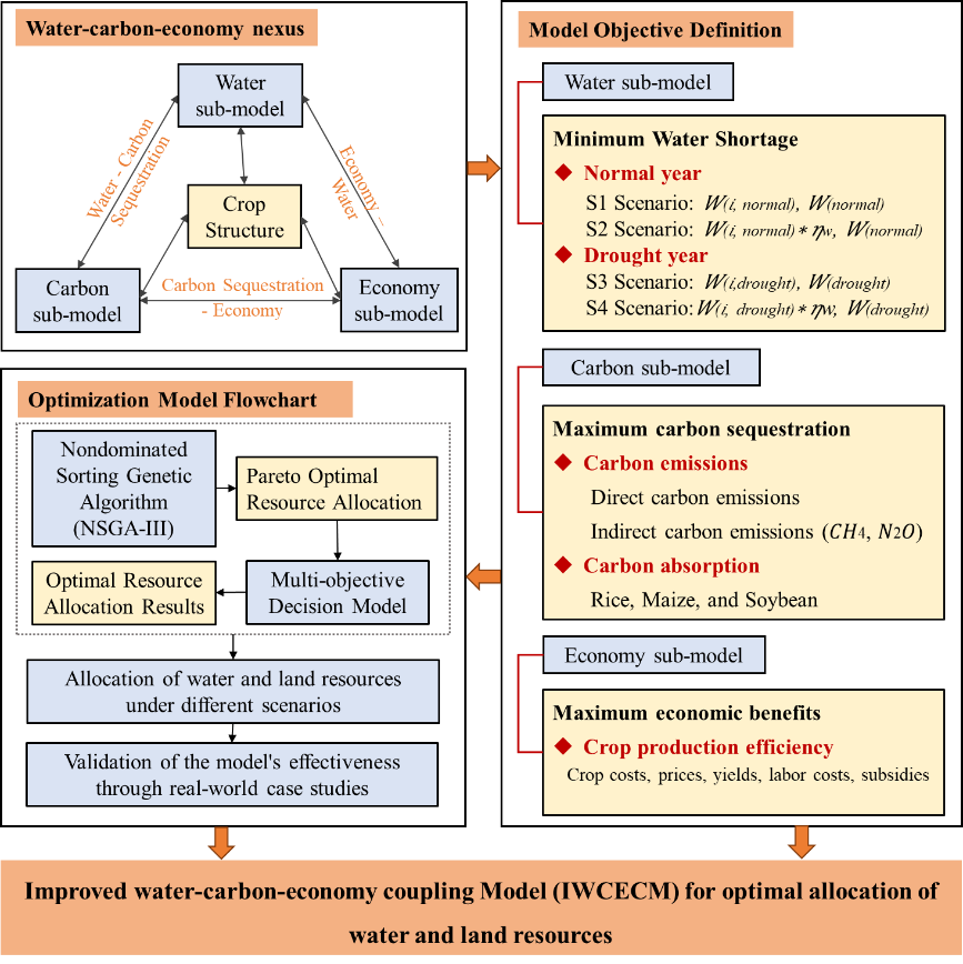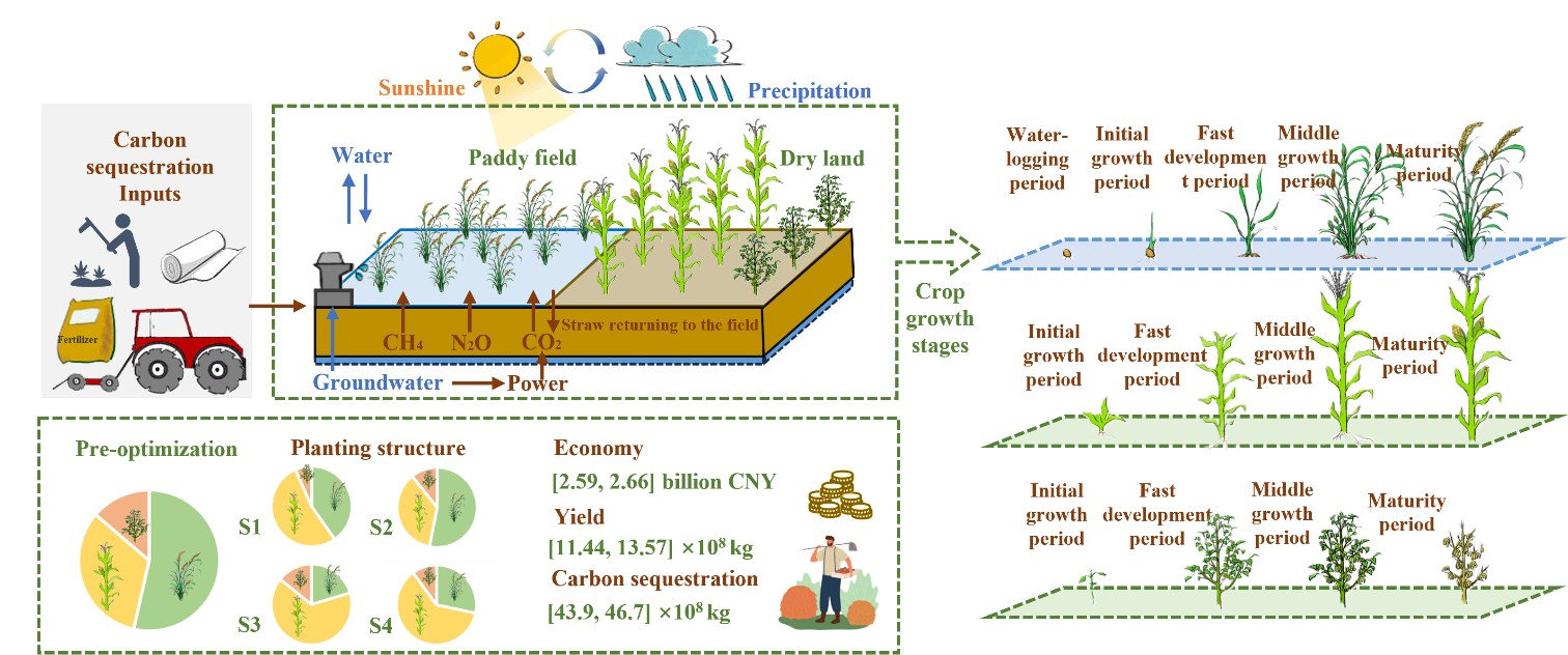 農(nóng)業(yè)灌溉占用全球取用水總量的70%以上。在國家“四水四定”的戰(zhàn)略背景下,解決水土資源時空不匹配的問題對保障我國糧食安全至關(guān)重要。水土資源之間聯(lián)系錯綜復(fù)雜,任何一種資源的短缺都會限制另一種資源的利用,從而降低水土資源的綜合利用效率。在開展農(nóng)業(yè)水土資源優(yōu)化配置研究時,如何協(xié)調(diào)二者之間關(guān)系是亟需解決的關(guān)鍵科學(xué)問題。然而,由于極端氣候頻率不斷增加和下墊面條件復(fù)雜性加劇,水資源年際間和年內(nèi)變異系數(shù)顯著增強(qiáng),充分滿足農(nóng)作物生長過程的水資源可持續(xù)供給面臨著巨大的挑戰(zhàn)。特別是在干旱時期,降水量的減少使得可供作物生長的有效降水量大幅下降,從而加劇了農(nóng)業(yè)生產(chǎn)用水的壓力。同時,農(nóng)業(yè)生產(chǎn)過程中過量施用化肥、農(nóng)藥和農(nóng)業(yè)機(jī)械會導(dǎo)致大量碳排放,對生態(tài)系統(tǒng)的穩(wěn)定構(gòu)成威脅。因此,從水-碳-糧食耦合視角開展基于作物需水過程的農(nóng)業(yè)水土資源優(yōu)化配置研究對保障我國糧食安全具有重要意義。
