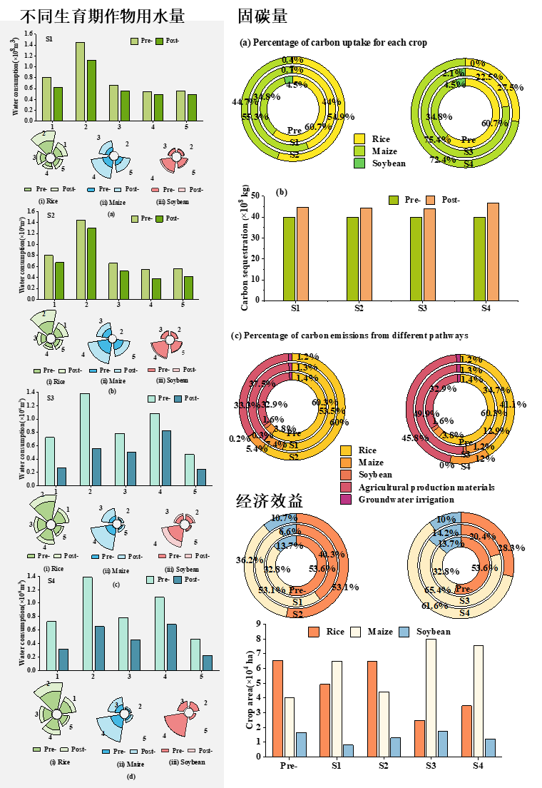 本研究突破了以往水資源分配中對作物需水過程過度概化的問題,并對我們之前研發(fā)的WCECM模型進(jìn)行了改進(jìn)。研究從作物灌溉用水、種植結(jié)構(gòu)、固碳量、經(jīng)濟(jì)效益和產(chǎn)量等多個角度進(jìn)行了深入分析。基于作物需水過程,提出了不同水文情景下的作物種植結(jié)構(gòu)和水資源優(yōu)化配置方案。通過 NSGA-III 算法選擇最優(yōu)解,并提出有針對性的優(yōu)化策略。最后將改進(jìn)的水-碳-經(jīng)濟(jì)耦合模型(IWCECM)在中國具有代表性的農(nóng)業(yè)主產(chǎn)區(qū)——三江平原友誼農(nóng)場進(jìn)行應(yīng)用和驗(yàn)證。結(jié)果表明,改進(jìn)后的模型不僅能夠根據(jù)不同情景精確調(diào)整作物種植結(jié)構(gòu),管理每種作物在不同生長階段的灌溉用水需求,還能提高固碳量、經(jīng)濟(jì)收入和糧食產(chǎn)量。具體而言,優(yōu)化后,平水年常規(guī)灌溉模式 (S1) 和節(jié)水灌溉模式 (S2)以及干旱年份的常規(guī)灌溉模式 (S3) 和節(jié)水灌溉模式 (S4)下的種植面積比例分別為4:5:1、5:4:1、2:7:1和3:6:1。與優(yōu)化前相比,四種方案的總固碳量分別增加了4.95×108 kg、4.56×108 kg、4.04×108 kg和6.84×108 kg,糧食總產(chǎn)量分別增加了1.72×108 kg、1.43×108 kg、0.69×108 kg和1.45×108 kg。除枯水年外,其他方案下的經(jīng)濟(jì)效益與優(yōu)化前無明顯差異。在平水年,作物在生長初期的總用水量最高;在枯水年,作物在生長中期的總用水量最高。該結(jié)果不僅對解決當(dāng)前農(nóng)業(yè)水資源和土地資源的相關(guān)挑戰(zhàn)具有現(xiàn)實(shí)意義,也為未來農(nóng)業(yè)的可持續(xù)發(fā)展提供了參考和建議。
