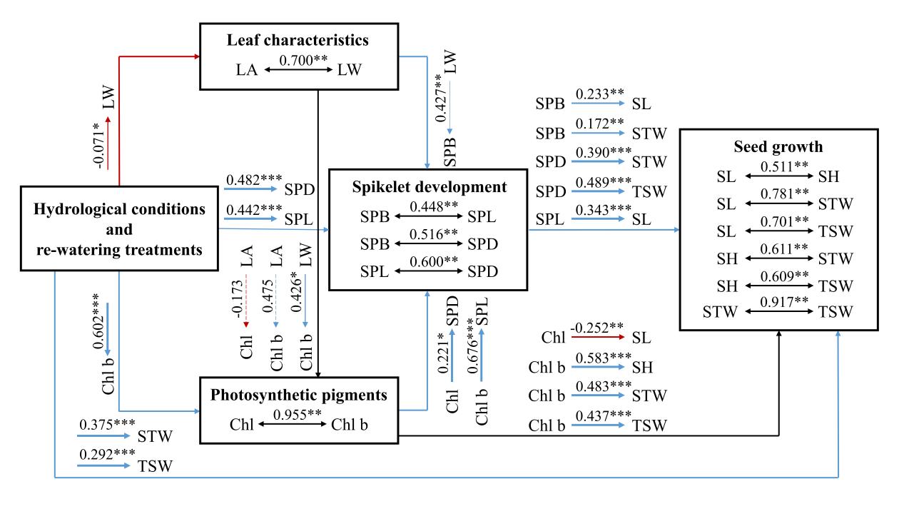 研究結(jié)果表明,初始水文條件和分時補(bǔ)水措施顯著影響了瘤囊薹草的小穗發(fā)育、種子生長、葉片發(fā)育以及光合色素積累。相較于其他處理,濕潤條件結(jié)合第15天補(bǔ)水至初始水文狀態(tài)的水文情勢顯著增強(qiáng)了瘤囊薹草小穗發(fā)育特征、種子生長特性,且葉片生態(tài)特征及葉綠素含量均高于其他處理?xiàng)l件。此外,小穗發(fā)育特征和種子生長性狀與葉片生態(tài)特征和葉綠素含量表現(xiàn)出顯著的相關(guān)性。在驅(qū)動機(jī)制方面,水文條件及補(bǔ)水情境直接影響了瘤囊薹草的小穗發(fā)育和種子生長,同時還通過調(diào)控葉片寬度和葉綠素b含量從而間接影響小穗發(fā)育過程和隨后的種子生長活動。總體而言,精準(zhǔn)補(bǔ)水措施通過多種途徑顯著影響瘤囊薹草的小穗發(fā)育和種子生長。結(jié)合半干旱區(qū)氣候特征及農(nóng)業(yè)發(fā)展?fàn)顩r,實(shí)施洪水和融雪水資源集約化利用以及農(nóng)業(yè)-生態(tài)水資源共管可作為半干旱地區(qū)高效利用水資源的關(guān)鍵策略。