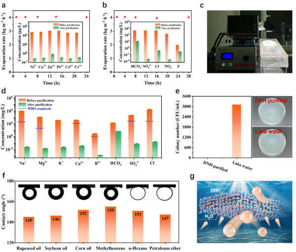在實際應(yīng)用中,DNH對重金屬污染的工業(yè)廢水(圖2a)、蘇打鹽堿水(圖2b)都表現(xiàn)出極好的處理效果。采用中國北方近海海水進行了戶外太陽能淡化實驗,結(jié)果顯示,水體中Na+、Mg2+、K+、Ca2+、B3+、HCO3?、SO42?和Cl?的含量在處理后分別為 0.025、0.014、0.023、0.037、0.001、6.995、0.079和0.157 mg/L,對應(yīng)的去除率分別為99.999%、99.999%、99.994%、99.990%、99.957%、95.062%、99.996% 和99.999%(圖2d)。凈化水中各種離子的濃度遠低于中國和WHO規(guī)定的飲用水標準限值。此外,DNH具有良好的除菌效果(圖2e),以及水下超疏油性,其對菜籽油、大豆油、玉米油和三種油性溶劑的接觸角均超過145°(圖2f),實現(xiàn)了優(yōu)異的防污能力,體現(xiàn)了其廣泛的應(yīng)用潛力。