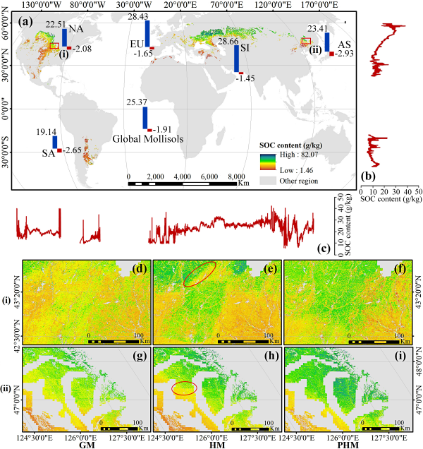 研究結(jié)果顯示,結(jié)合GEKD和A-CNN-ConvLSTM算法,SOC含量預(yù)測(cè)精度達(dá)到RMSE = 7.17 g/kg、R2 = 0.72、RPIQ = 1.92,優(yōu)于傳統(tǒng)模型。此外,PHM模型有效降低了SOC空間異質(zhì)性帶來的誤差,使預(yù)測(cè)結(jié)果更加平滑、穩(wěn)定。與全球模型相比,PHM將RMSE降低1.66 g/kg,R2和RPIQ分別提高0.06和0.15。研究生成了自1984年以來全球黑土區(qū)30m分辨率的SOC空間圖,并揭示了SOC含量下降的整體趨勢(shì)。其中,全球黑土區(qū)SOC平均下降1.91 g/kg,亞洲黑土區(qū)降幅最大(2.93 g/kg),西伯利亞黑土區(qū)降幅最小(1.45 g/kg)。該研究不僅為全球黑土區(qū)SOC動(dòng)態(tài)監(jiān)測(cè)提供了新技術(shù)手段,還為黑土區(qū)碳匯管理和農(nóng)業(yè)可持續(xù)發(fā)展提供了科學(xué)支撐。