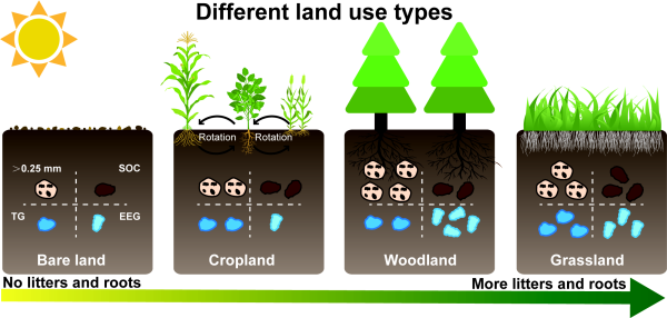 東北地理所黑土保護與利用學(xué)科組研究人員以1985年在東北黑土區(qū)建立的四種不同土地利用類型(裸地、農(nóng)田、草地和林地)為研究對象,利用團聚體分級的方法探討了不同團聚體粒徑中SOC、全氮(TN)以及GRSP(總球囊霉素TG和易提取球囊霉素EEG)的含量變化。研究結(jié)果表明,草地和林地生態(tài)系統(tǒng)的大團聚體比例、SOC、TN和GRSP含量均顯著高于農(nóng)田和裸地。TG在原土和大團聚體中的含量與土壤有機碳呈顯著正相關(guān),而EEG在較小團聚體粒徑中發(fā)揮了更重要的作用。球囊霉素組分在不同團聚體尺寸中對土壤有機碳積累的差異性影響,突顯了SOC動態(tài)的復(fù)雜性以及考慮團聚體尺度過程的重要性。此外,我們觀察到GRSP組分與土壤團聚體穩(wěn)定性之間存在顯著正相關(guān)關(guān)系。這些發(fā)現(xiàn)強調(diào)了GRSP作為一種持久性結(jié)合劑的關(guān)鍵作用,它積極參與土壤團聚體的形成和穩(wěn)定,從而間接增強了土壤有機碳的保護和持久性。總體而言,本研究揭示了土地利用方式、土壤團聚體、GRSP和SOC之間的復(fù)雜關(guān)系。研究結(jié)果強調(diào)了保護和恢復(fù)自然植被覆蓋(如草地和林地)對于促進土壤有機碳固存和緩解氣候變化的關(guān)鍵重要性。