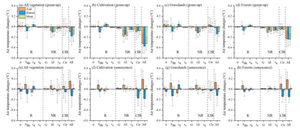 圖2. 不同水文氣候條件下植被物候變化影響氣溫的生物物理機(jī)制