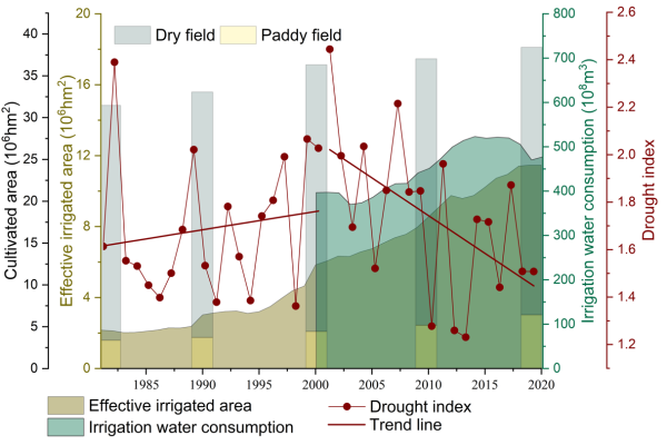 圖1 東北黑土區(qū)耕地面積(1981-2020年)、有效灌溉面積(1981-2020年)、灌溉用水量(2000-2020年)和干旱指數(shù)(1981-2020年)