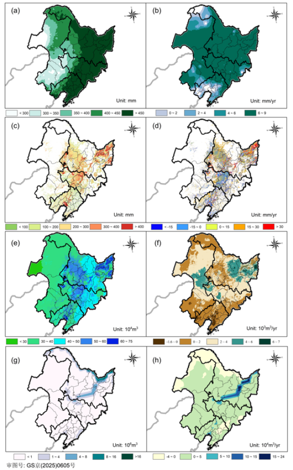 圖2 東北黑土區(qū)藍(lán)綠水資源演變特征 (a) 不同生育期有效降雨量;(b) 有效降雨量變化率;(c) 作物實(shí)際蒸發(fā)量;(d) 作物實(shí)際蒸發(fā)量變化率;(e) 農(nóng)業(yè)綠水資源量;(f) 農(nóng)業(yè)綠水資源量變化率;(g) 農(nóng)業(yè)藍(lán)水資源量;(h) 農(nóng)業(yè)藍(lán)水資源量變化率