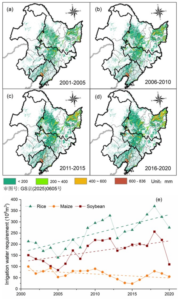 圖3 東北黑土區(qū)作物灌溉需水量(a)2001-2005年空間分布特征(b)2006-2010年空間分布特征(c)2011-2015年空間分布特征(d)2016-2020年空間分布特征(e)2001-2020年水稻、玉米、大豆灌溉需水量年際變化特征