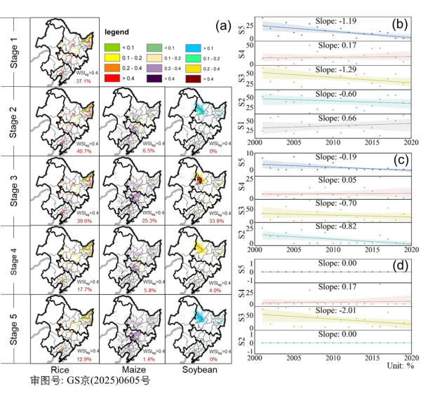 圖 4 (a)水稻、玉米、大豆不同生育期農(nóng)業(yè)水資源短缺指數(shù)(WSIag)的平均值,(b)~(d) 2001-2020 年水稻、玉米、大豆不同生育期農(nóng)業(yè)水資源短缺指數(shù)變化特征。(注釋:第 1 階段:泡田期,第 2 階段:初始生育期,第 3 階段:快速發(fā)育期,第 4 階段:生育中期,第 5 階段:成熟期)