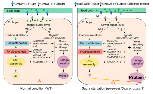 大豆種子中糖水平調(diào)控油分 - 蛋白平衡的模型