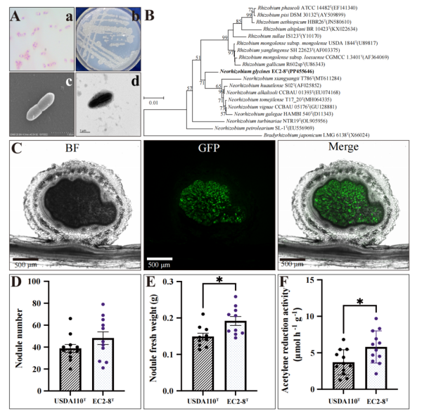 圖1 (A) 菌株EC2-8T表型特征。革蘭氏染色(a),菌落在YMA培養(yǎng)基生長形態(tài)(b),掃描電鏡(c),透射電鏡(d);(B) 基于16S rRNA基因序列構建的系統(tǒng)發(fā)育樹;(C) 熒光標記菌株EC2-8T侵染大豆根瘤,圖像拍攝于接種后14天,比例尺:100微米。BF,明場圖像;GFP,GFP熒光;Merge,GFP和明場圖像的疊加;(D–F) 接種菌株EC2‐8T和USDA110T對大豆部分生長指標的影響:根瘤數(shù)量(D),根瘤鮮重(E),乙炔還原活性(F)。P < 0.05
