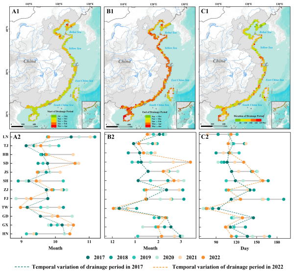 圖1. 中國濱海養(yǎng)殖池排水期的空間變化