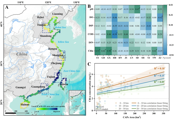 該研究從國家尺度揭示了中國濱海養(yǎng)殖池排蓄水的時空動態(tài)變化,并從濱海養(yǎng)殖池空間分布和排水動態(tài)兩個角度,定量解析了濱海養(yǎng)殖池對近海水質(zhì)參數(shù)的影響。研究結(jié)果可不僅可服務(wù)于海岸帶漁業(yè)可持續(xù)發(fā)展,還可為保障海洋生態(tài)安全提供科學(xué)支撐。