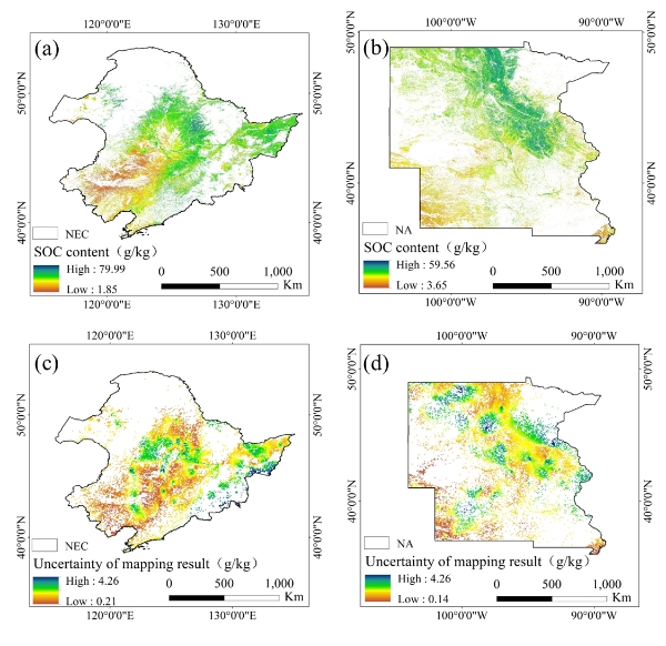 圖1. 中國東北與北美黑土區(qū)SOC制圖結(jié)果