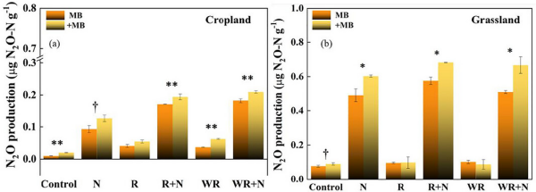 分析表明,低碳氮比的植物殘?bào)w易分解,能快速為微生物提供能量,促進(jìn)反硝化過(guò)程;高碳氮比殘?bào)w則會(huì)增強(qiáng)微生物對(duì)氮素的固定,在農(nóng)田土壤中卻因微生物量增加而緩解了這一效應(yīng),反而促進(jìn)了N?O排放。值得注意的是,在低碳農(nóng)田土壤中,微生物量的增加主要響應(yīng)外源碳的輸入,微生物量碳的動(dòng)態(tài)變化是主要控制因子。而碳含量較高的草地土壤對(duì)氮素添加更為敏感,其N?O排放因子顯著高于農(nóng)田土壤(圖2), 進(jìn)一步證實(shí)微生物量氮和無(wú)機(jī)氮的動(dòng)態(tài)變化是驅(qū)動(dòng)其N?O排放的關(guān)鍵調(diào)控因子。研究成果不僅深化了對(duì)土壤碳氮循環(huán)與溫室氣體排放關(guān)系的科學(xué)認(rèn)知,更為我國(guó)踐行 "雙碳"目標(biāo)、推進(jìn)農(nóng)業(yè)綠色低碳發(fā)展提供了新的技術(shù)路徑。