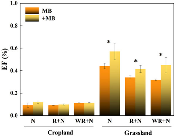 圖2土壤微生物量大小和植物殘?bào)w添加對(duì)農(nóng)田和草地土壤氧化亞氮排放因子(EF)的影響