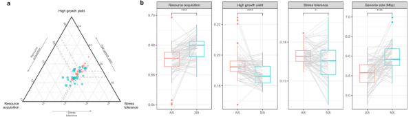 農(nóng)田土壤顯著降低了土壤生物群落在分類組成、功能基因和生態(tài)策略的空間異質(zhì)性。農(nóng)田土壤中細(xì)菌、真菌、古菌、微型動(dòng)物群落(圖1)及功能基因(圖2)在局域和區(qū)域尺度均表現(xiàn)出顯著的均質(zhì)化趨勢(shì),這種均質(zhì)化現(xiàn)象與土壤性質(zhì)的趨同性密切相關(guān)。農(nóng)業(yè)活動(dòng)改變了細(xì)菌群落的生態(tài)策略(“Y-A-S” 理論框架,圖3),其資源獲取(A策略)的功能基因減少,而與生長(zhǎng)產(chǎn)量(Y策略)和脅迫耐受(S策略)的基因顯著增加,表明農(nóng)業(yè)系統(tǒng)更傾向于選擇快速生長(zhǎng)、抗逆性強(qiáng)的微生物類群。農(nóng)田土壤中細(xì)菌的平均基因組大小顯著減小,反映了在農(nóng)業(yè)干擾下微生物通過(guò)“基因組精簡(jiǎn)”(Black Queen hypothesis)降低了生物的代謝成本、提高了適應(yīng)性的生態(tài)權(quán)衡。