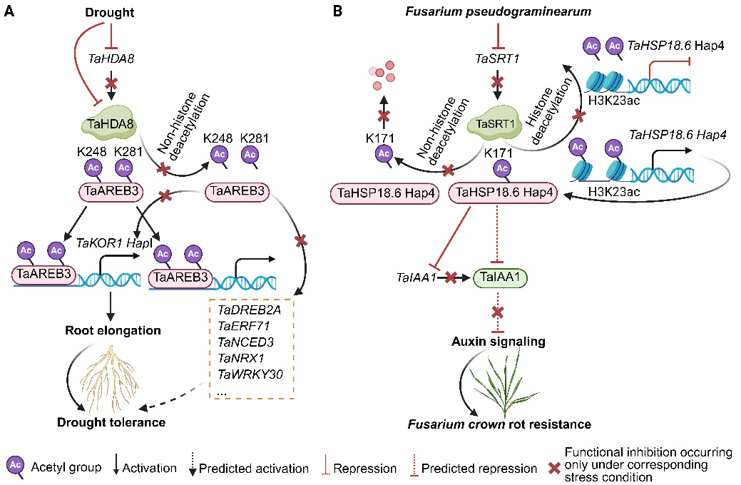 團(tuán)隊(duì)以Nonhistone deacetylation: a switch for crop resilience為題發(fā)表于Trends in Plant Science的 Spotlight文章指出,組蛋白去乙酰化酶(HDAC)介導(dǎo)的非組蛋白去乙酰化在作物逆境響應(yīng)中充當(dāng)重要的分子開關(guān)。在小麥中,組蛋白去乙酰化酶TaHDA8通過去乙酰化轉(zhuǎn)錄因子TaAREB3抑制根系伸長(zhǎng),從而負(fù)調(diào)控抗旱性,但干旱脅迫會(huì)抑制TaHDA8的蛋白豐度;組蛋白去乙酰化酶TaSRT1通過去乙酰化熱激蛋白TaHSP18.6抑制生長(zhǎng)素信號(hào),進(jìn)而負(fù)調(diào)控鐮刀菌冠腐病抗性,而病原侵染同樣會(huì)降低TaSRT1的蛋白豐度。由此,生物脅迫與非生物脅迫觸發(fā)的“去乙酰化作用解除”可作為提升作物抗逆性的調(diào)控開關(guān),為抗逆育種提供了可模塊化利用的新靶點(diǎn)。