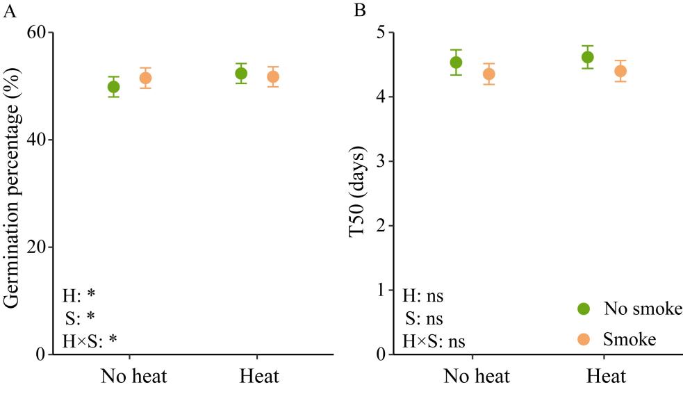 圖2 煙信號(hào)(無煙vs.有煙)和高溫信號(hào)(無熱vs.有熱)組合下的萌發(fā)率及T50