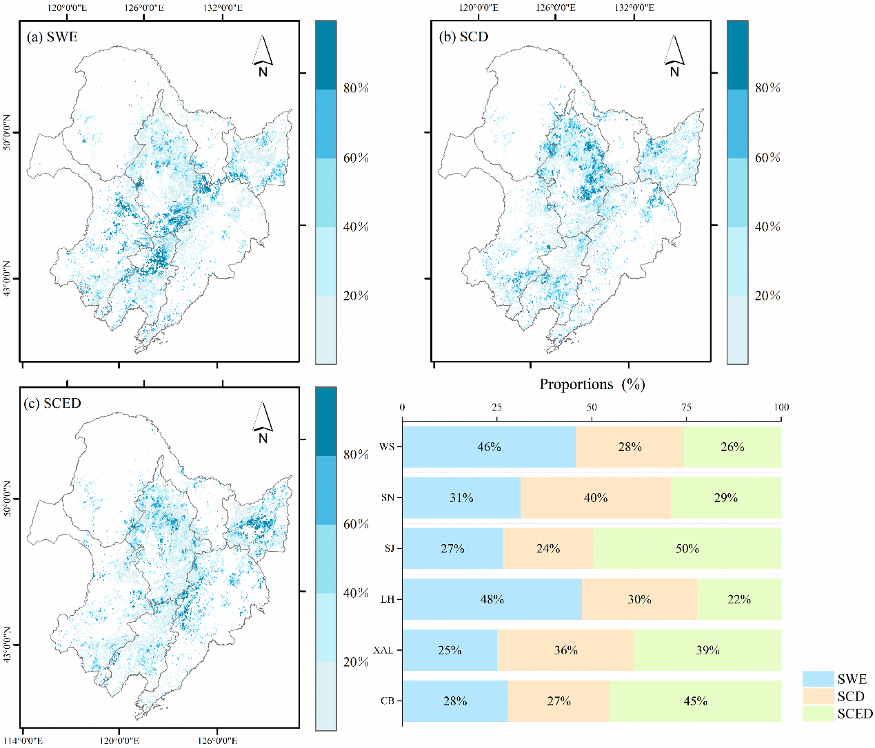研究首次揭示了積雪對旱田GPP影響的農(nóng)業(yè)分區(qū)特征:在西部風(fēng)沙區(qū)和遼河平原,雪水當(dāng)量(SWE)主導(dǎo)GPP變化,其增墑效應(yīng)有效緩解了春旱制約;在松嫩平原,積雪日數(shù)(SCD)是首要驅(qū)動(dòng)因素,反應(yīng)積雪保溫與供水雙重功能;在長白山和興安嶺地區(qū)等高寒區(qū),融雪終日(SCED)影響最大,融雪雖然補(bǔ)充土壤水分,卻因降低春季地溫形成熱限制,對GPP產(chǎn)生抑制作用。