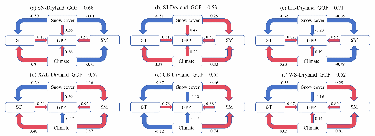 PLS-SEM方法量化了積雪通過土壤水熱條件影響耕地GPP的作用路徑,具體表現(xiàn)為熱量效應(yīng)和水分效應(yīng)。在熱量效應(yīng)上,積雪通過降低土壤溫度抑制GPP。在水分效應(yīng)上,積雪在干旱水分區(qū)(如西部風(fēng)沙區(qū)、遼河平原)促進(jìn)GPP,而在高寒熱限區(qū)(如長白山、興安嶺等)積雪抑制GPP。